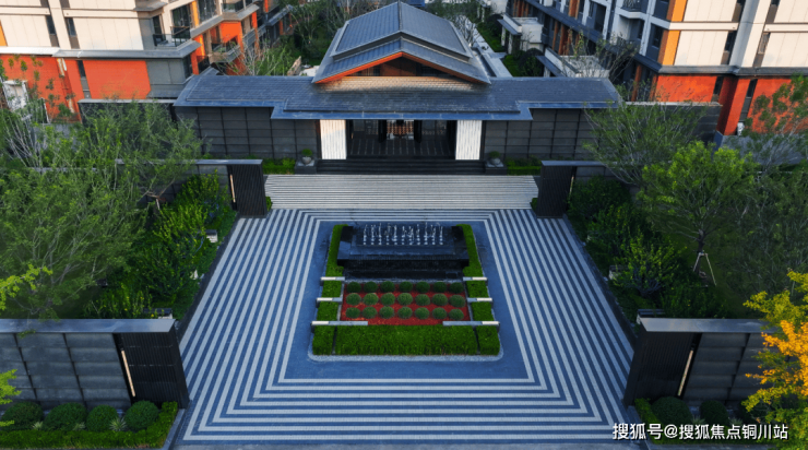 首先项目在入口处的绿植选择上,就很有讲究。入口处8棵金桔象征吉祥美满,8棵朴树与院内的榉树构成“前榉后朴”的格局,这是祝福孩子学业有成的古雅心意,而21棵白蜡树环抱水景,则是取意“遇水则发”。