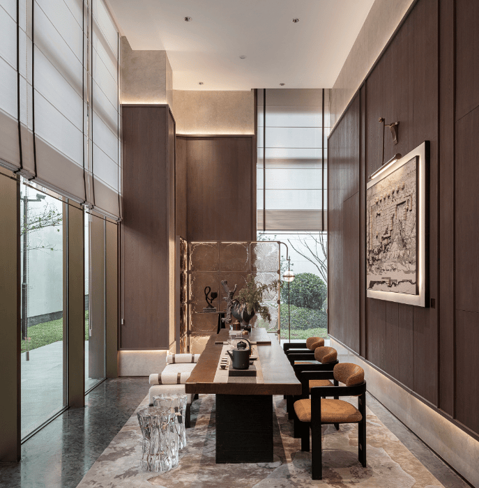 当户内在完成社区与滨江的融合时,项目整体公区也在以江景为源,给出了一个真正能取悦生活的设计