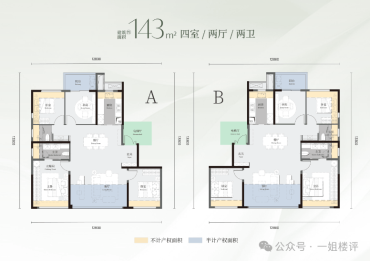 最大户型是建面约166平四房两厅三卫,这个户型也有两种结构。