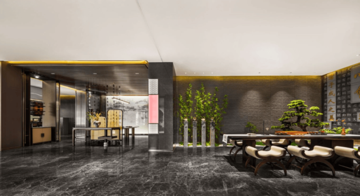 整体10米层高,搭配上方的格栅铝板造型,同步外面建筑的格调,营造出开阔高深的氛围感。