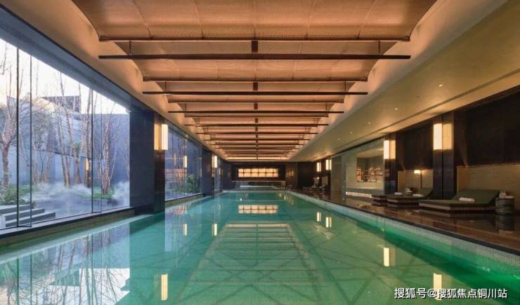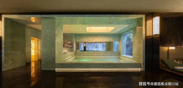 绿城又专门造了一座疏影横斜的花园,把它许配给室内恒温泳池。那片河桦林,会反射出丝缎的细腻质感。池底是非常高级的几何图形,来自义乌藤编的纹理。泳池里的每一种色彩,都遵循了各种玉器的色彩体系。克制,在无声处着色;而绚烂,则是被他们藏在了泳池边用喜马拉雅盐砖铺砌的桑拿房里。