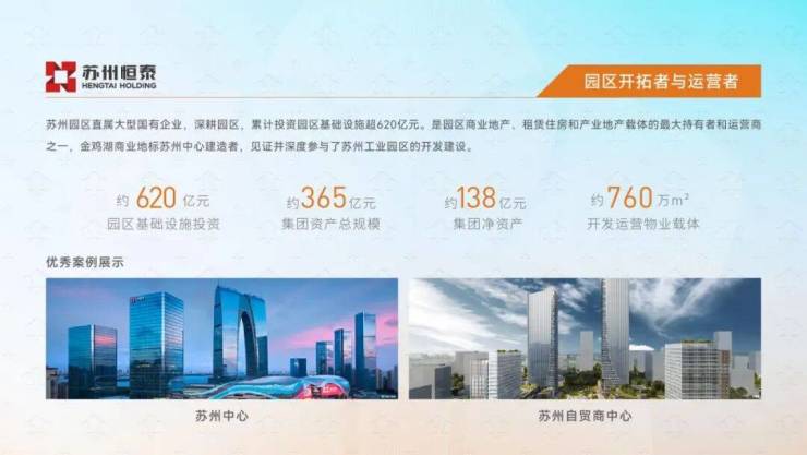 中新合作苏州工业园区直属的大型国有企业,累计开发各类物业载体约760万平方米,拥有苏州中心、苏州自贸商务中心等代表项目,目前已成为园区商业地产、产业地产、租赁住房领域重要的载体持有者和运营商。