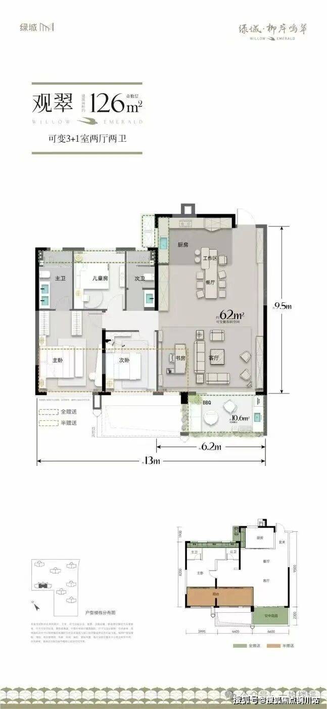 最小面积的户型:建面约126平的3+1房,该户型在连廊中间套位置,南向带错层空中花园,部分楼层空中花园在客厅,部分楼层空中花园在书房和次卧。