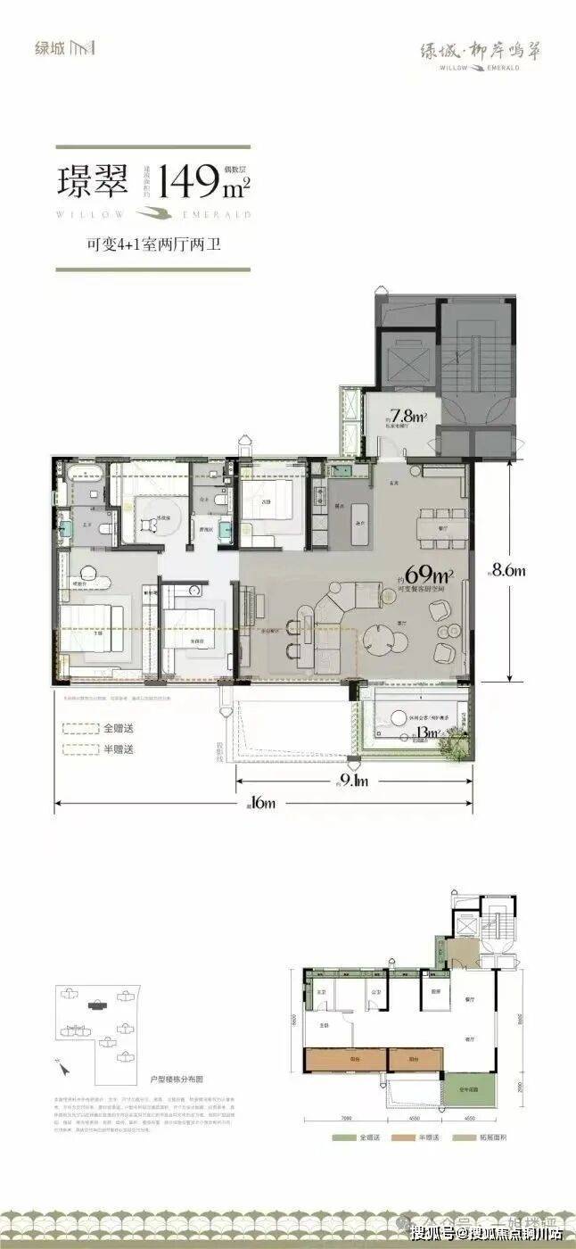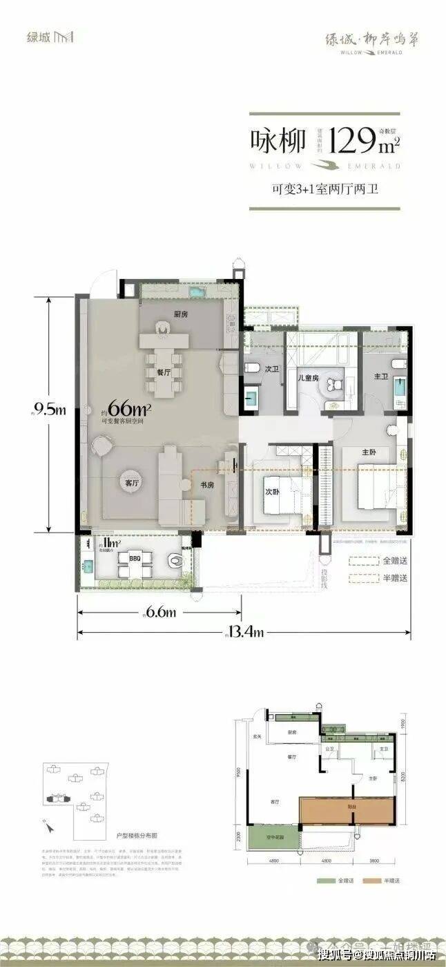 建面约129平的3+1房户型:位于2号楼边户,南北通透,3.5开间朝南,和126平户结构近似,也是南向带错层的空中花园,不过该户型是边套,通透性和私密性略胜一筹。