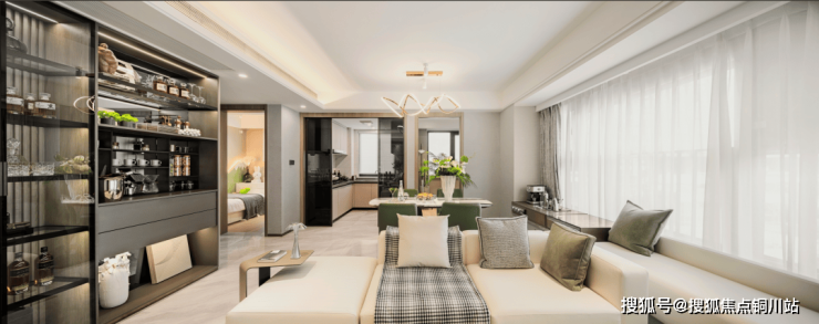 一方餐客厨无界一体的家庭交流公区,孩子的玩具、父亲的茶席、母亲的瑜伽垫可以和谐共处,同时与约5.4米观景飘窗无缝连接,将冬日清晨的暖阳和风景一并邀入室内,在这方足够开阔的空间,承载家人之间无隔阂的陪伴,亲友欢聚一堂,尽享温情与暖心时光。