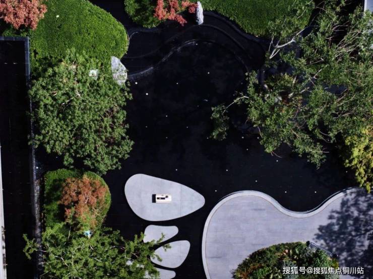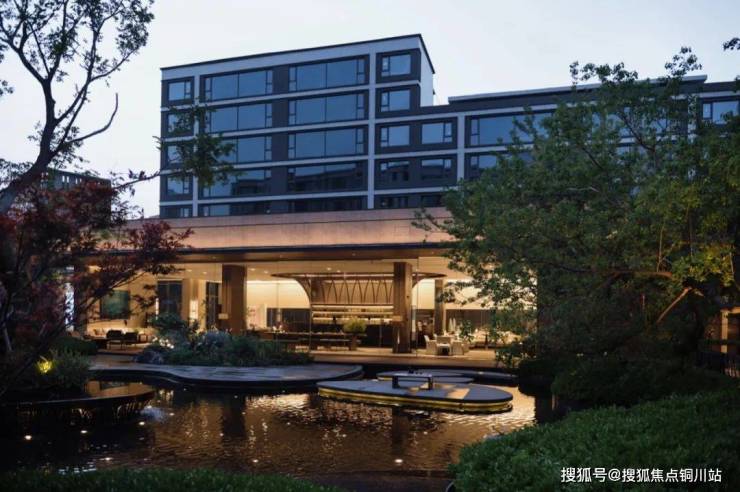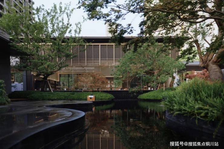 以《西园雅集》为空间情绪蓝本,秉承“将社交置入静谧”的哲学,在三进归家的东方游园过程中,以镜面水景嵌套四季酒店式度假场景:约2000㎡水域倒映天空树影,水下茶席与大面积落地玻璃交织对话“曲水流觞”,复刻北宋美学生活的极致和雅致,以都市度假场景营造,为2848位业主,在繁华都市中造一座自然岛屿。