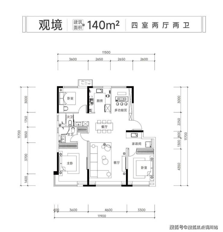 建面约140㎡观境:三代同堂的 “私密天地”—— 经典四叶草户型,主卧套房(带独立卫浴 + 衣帽间)、老人房、儿童房分别位于四角,互不打扰。