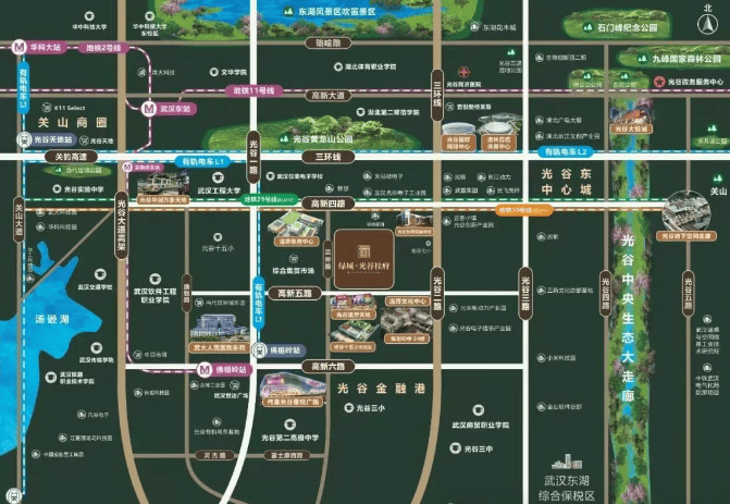 教育配套:项目规划自建幼儿园,周边齐集光谷为明实验学校、十五小(东校区)、三小、三初、二高、剑桥国际高中等学校,此外还规划有一所 24 班制初中(已启动招标)。