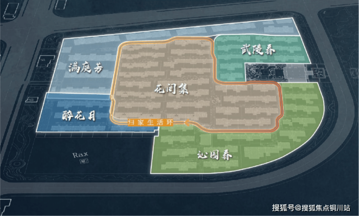 项目还借鉴苏州街巷式之形,以“一环五庭三坊七巷”为布局理念,通过宅、巷、园、庭、门的归家关系,引领人们隅游一方秘境,梦回隐世桃源画卷。