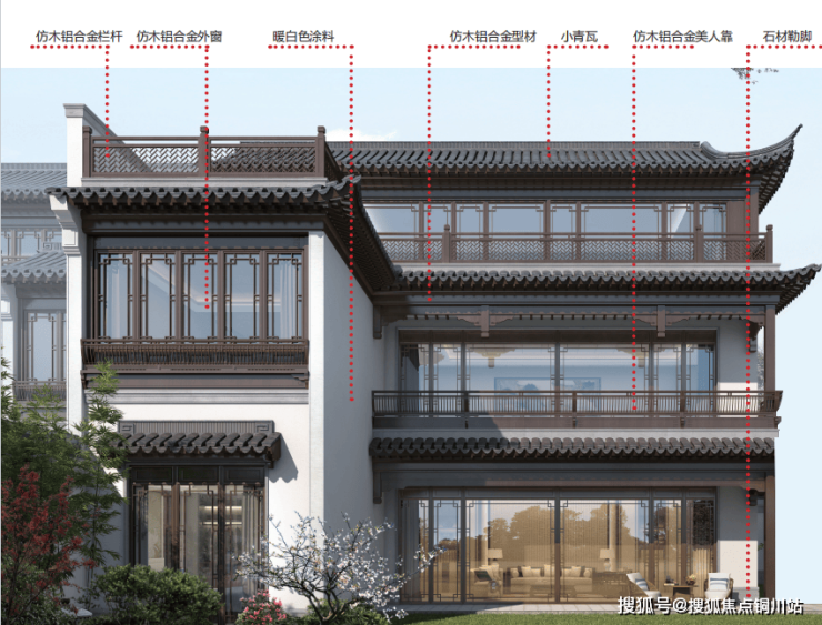 小青瓦、仿木铝合金栏杆、石材勒脚,多种材质交叠,与窗框交响辉映,增添了中式大宅贵气的同时,又呈现出现代形、东方意、未来感。