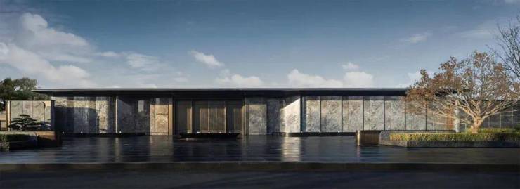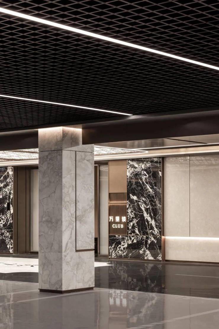 中间4扇纯铜锻造的大门长约60米,雕刻着故宫门窗传统纹样双交四椀菱花,同时大面积深色石材模仿了长江独特的岩壁地貌,传颂着长江的气韵,也彰显出归家的尊贵之感。