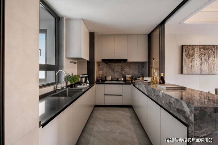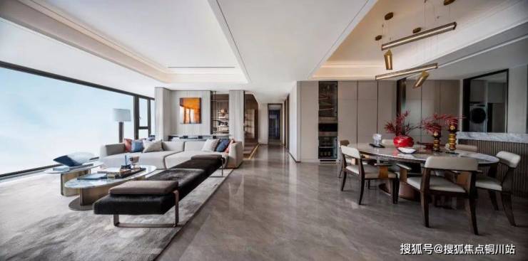 LDKB一体化设计+中西双厨,超大的尺度感增强空间的互动性和展示性,业主可以在此招待亲朋好友,也可以静静站在落地窗前,将盛景拥揽入怀。