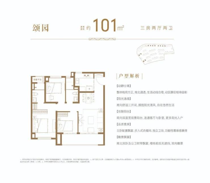 在101㎡三房两厅两卫户型中,除了完美继承89㎡户型高利用率、大飘窗等优势外,还增加了独立玄关和玄关收纳,主卧设计独立卫生间,居住体验更上一层楼。