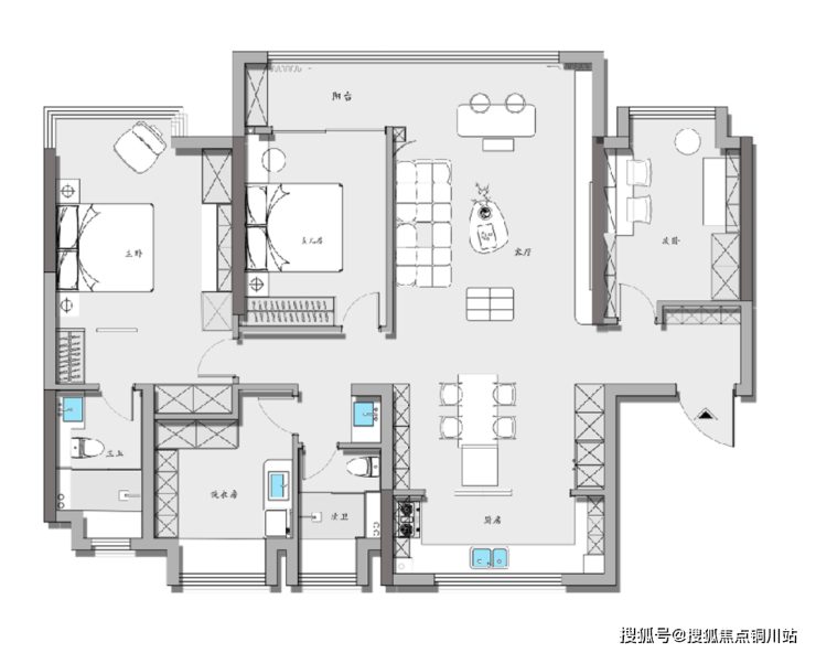 本案为精装交付,原始户型四室两厅。户型方正,三房朝南,采光优渥,餐厅开间大,操作舒适。不足之处主要在于卧室内部较局促,无独立收纳空间。