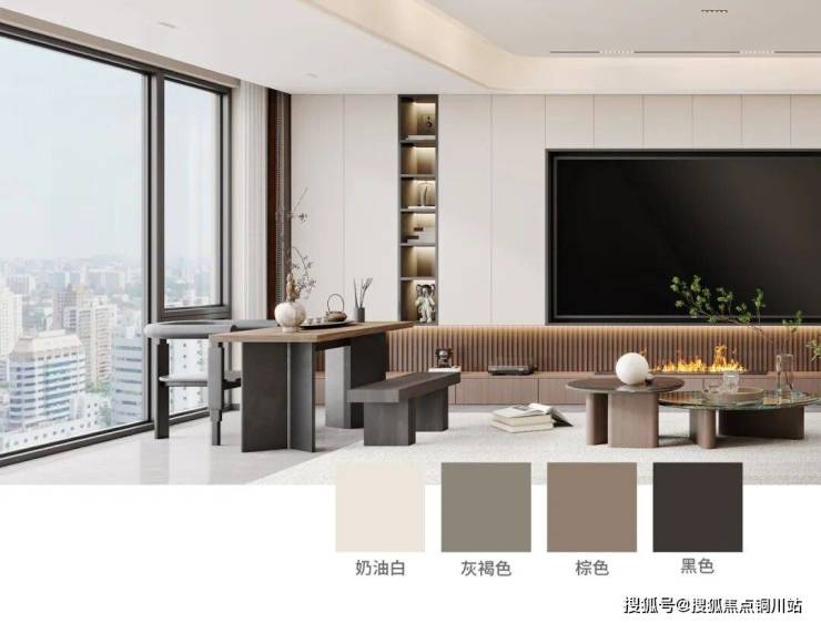 在材料方面,本案以可可蛋奶艺术漆为主背景,木饰面为空间增添气息,浅色柜体与整体环境相互协调,深色家居丰富空间层次。