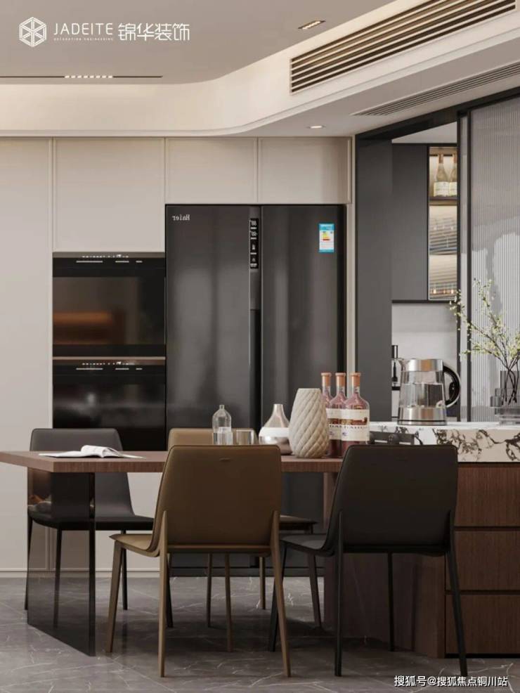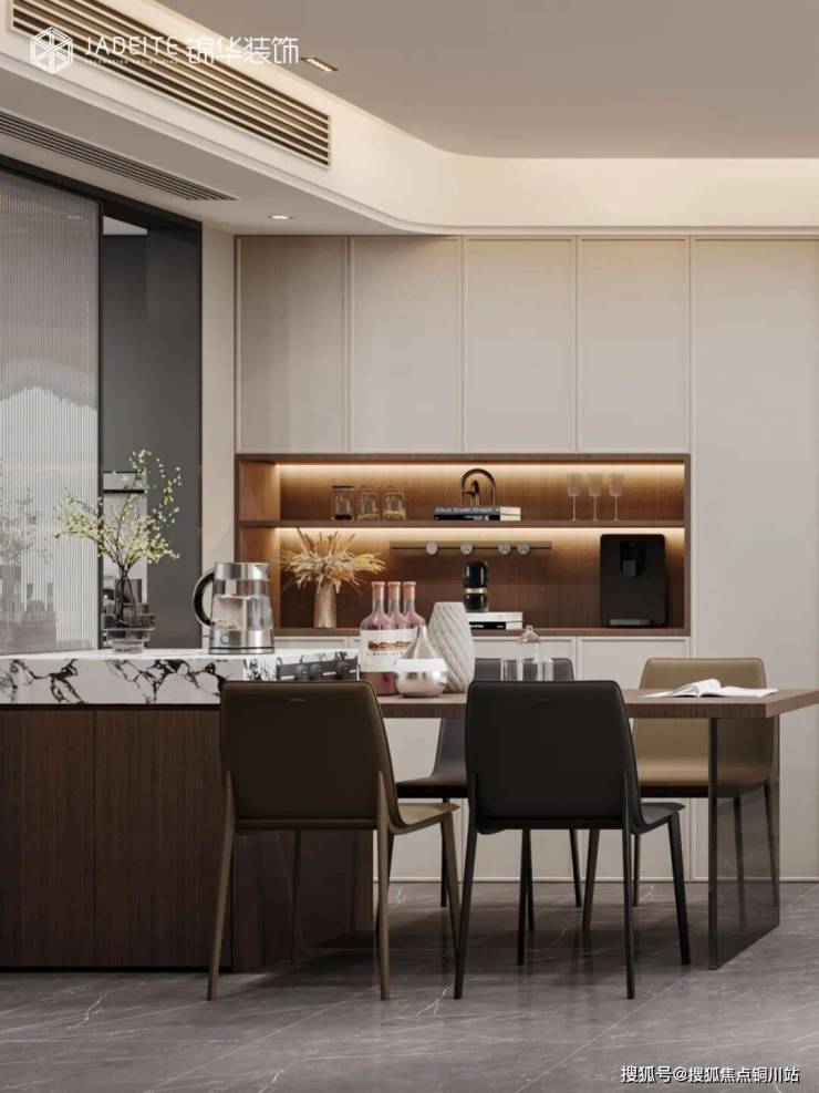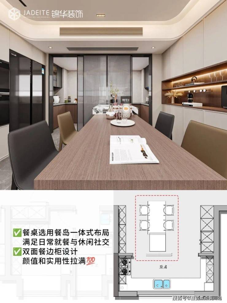 ②餐厅选用餐岛一体式布局,满足日常就餐与休闲社交,双面餐边柜颜值与实用性拉满💯。