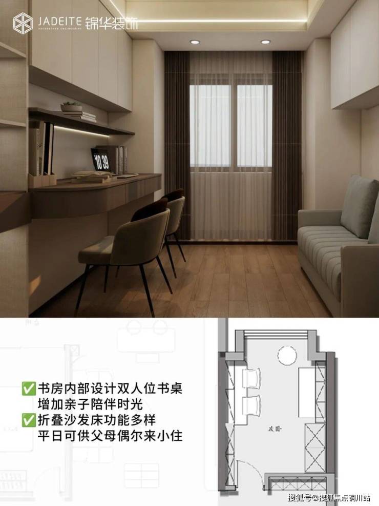 ③书房内部设计双人位书桌,增加了静谧的亲子陪伴时光,折叠沙发床功能多样,平日可供父母偶尔来小住。