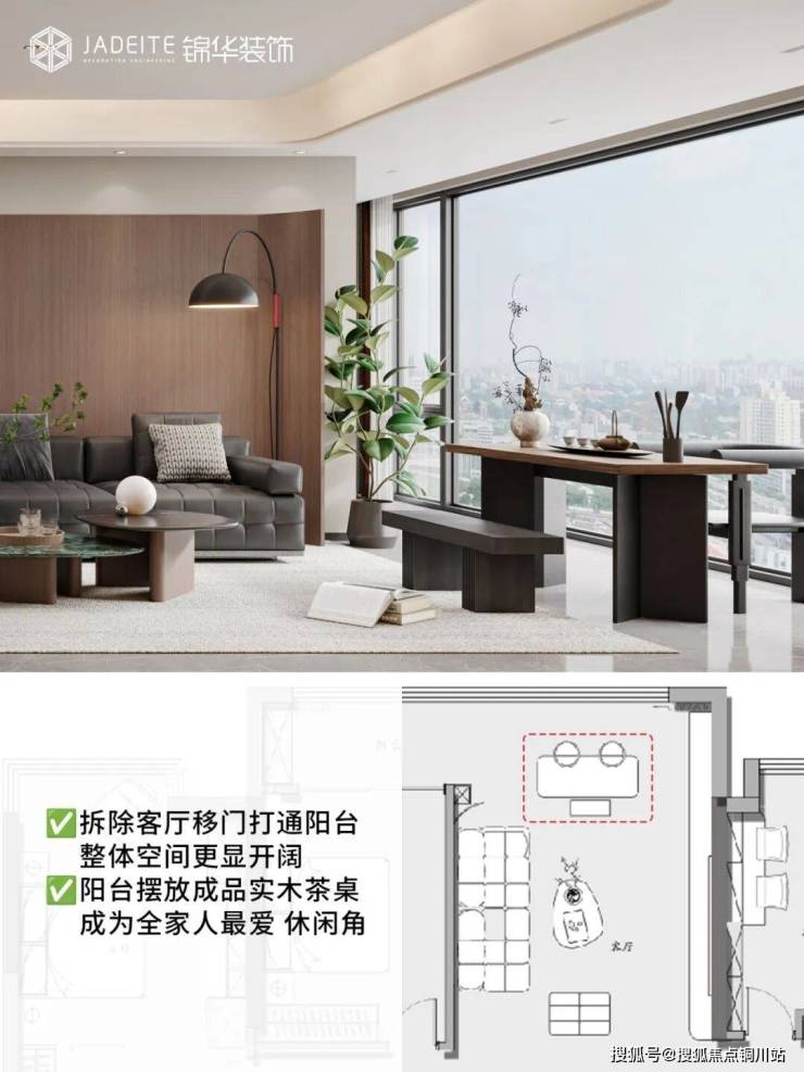 ①客厅拆除移门将阳台打通,整体空间超显开阔,阳台摆放成品实木茶桌,成为全家人最爱的品茗休闲角。