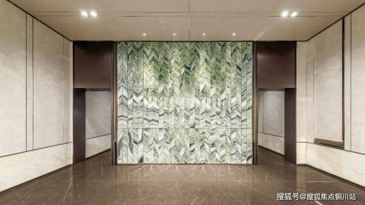 地下车库入户大堂亦延续同等精装标准,以青绿色石材背景墙与铝板吊顶工艺,打造从容过渡至私属领域的静谧序厅。