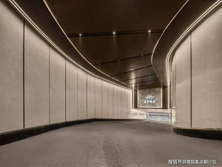 昭示区特别设计采光井,引入自然光线,结合质感发光灯膜,彻底打破传统地下空间的压抑感,造型上铝板吊顶+灯光膜+地面局部石材+专属楼栋指示,完美契合高端客户的置业需求。