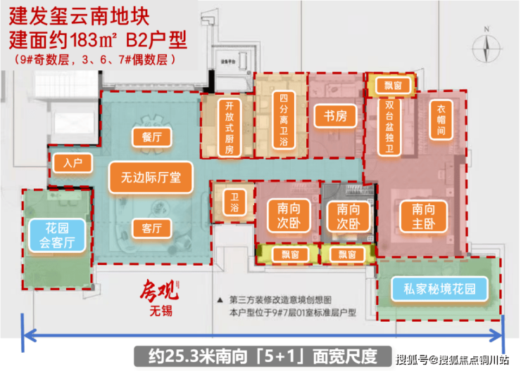 约25.3m南向奢阔「5+1」奢阔开间,双露台朝南,带来全景环幕视野。
