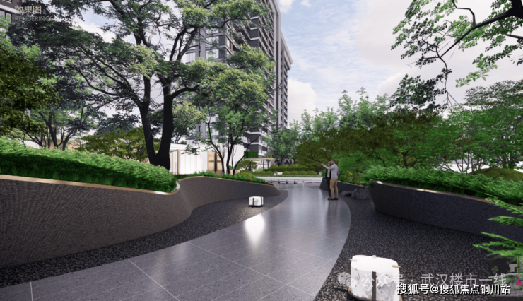 项目入口处,规划了错落有致的飘阵树池,搭配深浅相间的水磨石,真实还原了“曲径通幽处,禅房花木深”的意境!