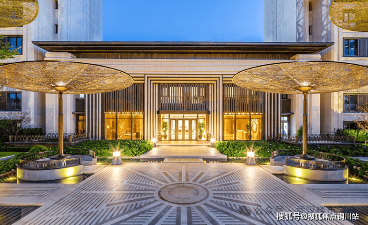 共约1000平入户大门,总长度近26米, 大门铝材配合大理奢石,整体效果恢弘时尚。
