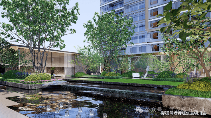 入口处的设计有层叠的水系和绿植,再加上有水瀑的影墙,让整个景观显得格外清爽宜人。