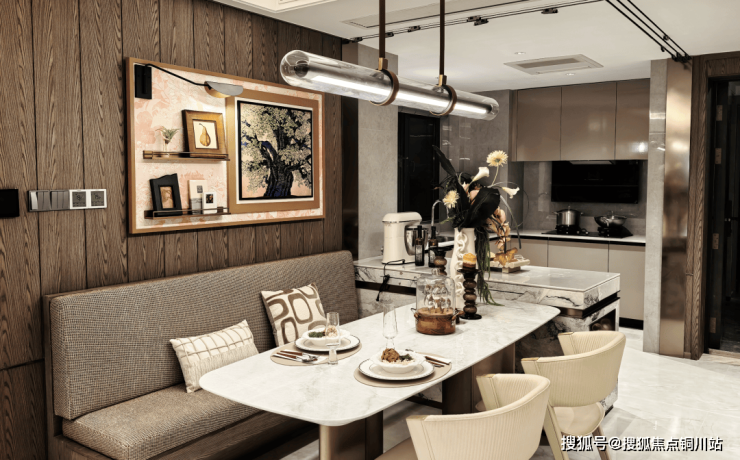在柳岸晓风样板房中,厨房不再是传统意义上的封闭空间,而是整个家庭的社交中心。“岛台=派对中心+咖啡bar+办公区"的设计理念,彻底颠覆了传统厨房的功能边界。开放式厨房与中岛台的完美结合,创造出流畅的LDKG洄游动线,让烹饪过程变成一场视觉与味觉的双重享受。