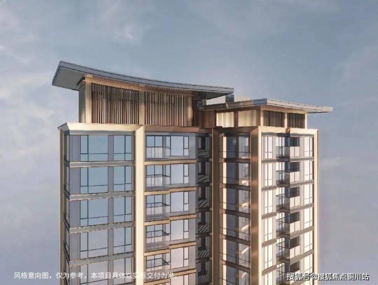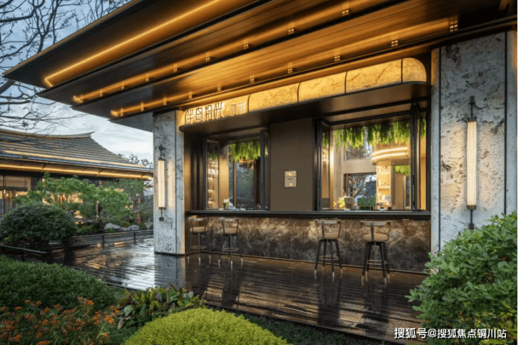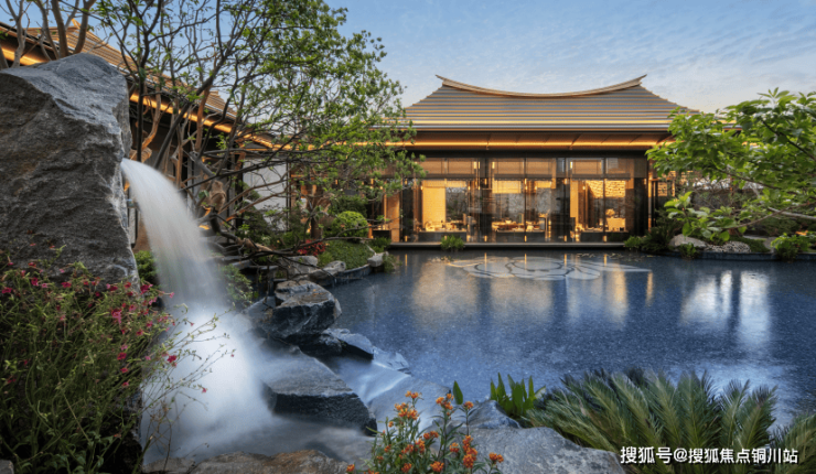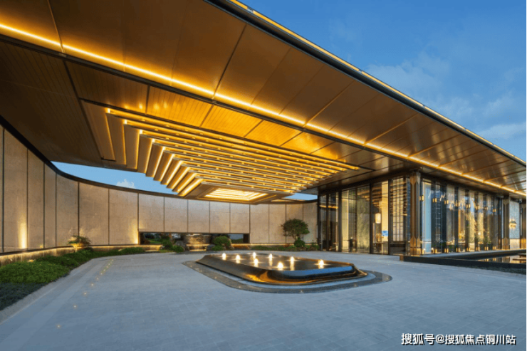 大门主入口引入“把酒店搬回家”的产品理念和“回家即度假”的生活理念,打造奢华酒店式归家大门。屋顶高约9.7米,整体挑檐向两侧延伸,长约49米,庑殿金顶的屋顶形态,以现代化的设计手法融入传统屋顶形式,结合鲁班锁倒影装置传达山水倒影的意境生活。