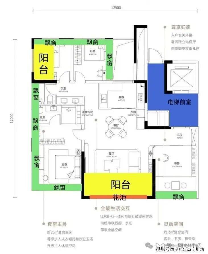 超大电梯前室,出电梯就仪式感满满;客餐厅270°拐角大阳台+270°拐角大花池,拓展出约59平的宴会级社交场域;除客餐厅外,其它房间均有飘窗优化空间,切实做到了360°空间赠送;主卧和北向次卧,实现了少有的双面飘窗或飘窗+生活阳台的双面空间优化……