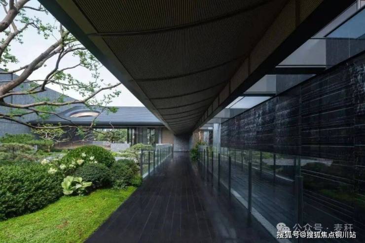 走过约40米和风游廊、黛色青瓦下,踏星而行,复现古时大宅堂前,实现四季有景、步移景异,在自然行径之中,构建「四水归堂」的风雅之景