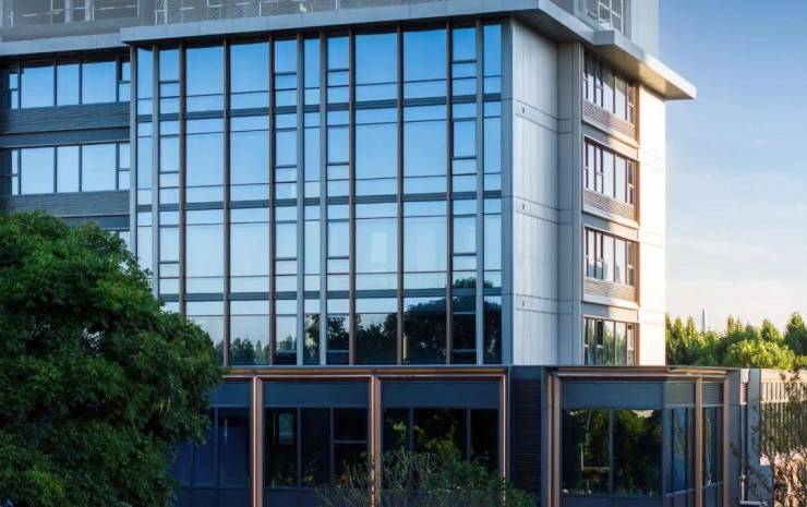 整个外立面不仅仅拥有极致窗墙比,更在用材上甄选银灰色氟碳铝板+浅蓝灰玻璃,嵌入香槟色铝板、点缀香槟翠石材。