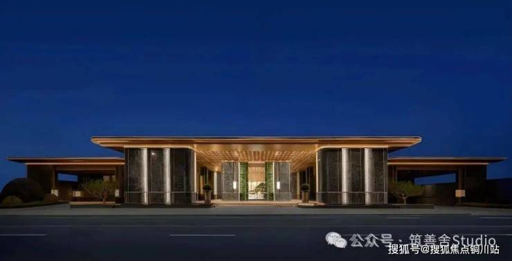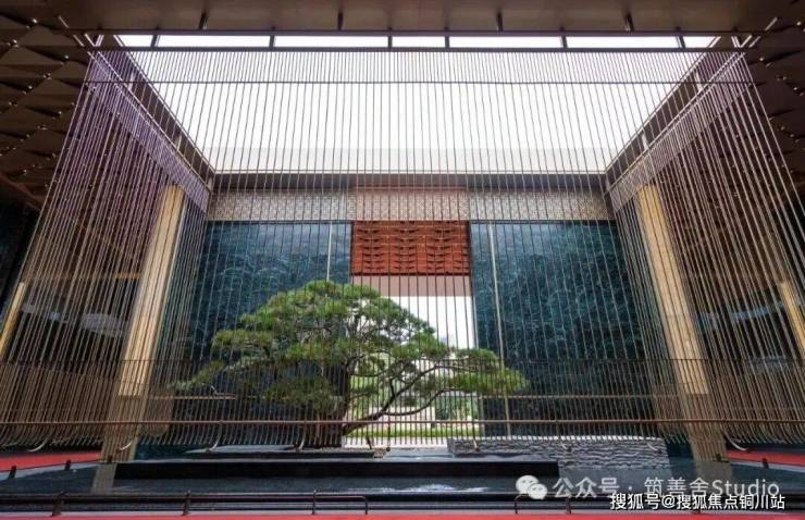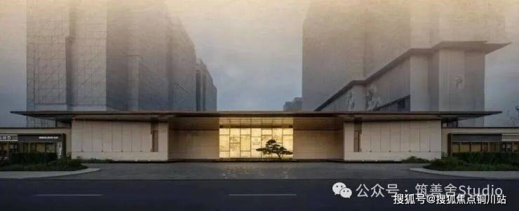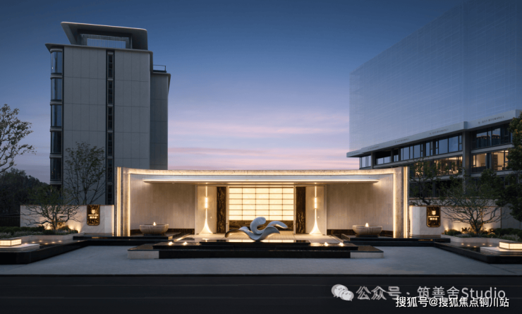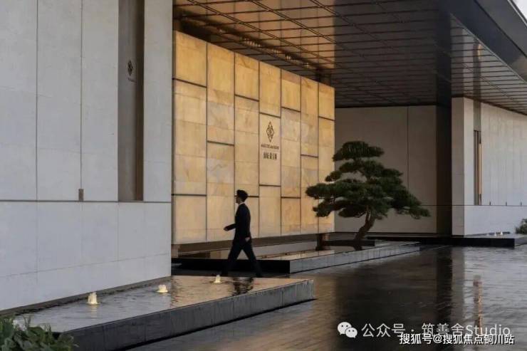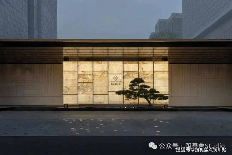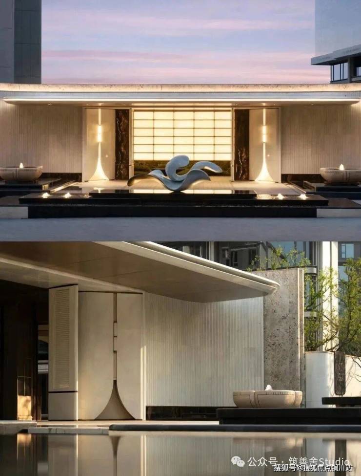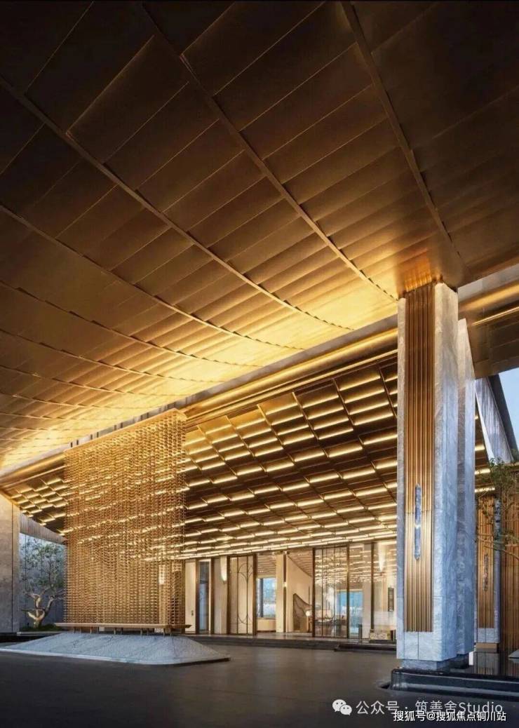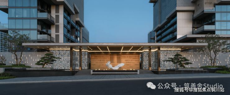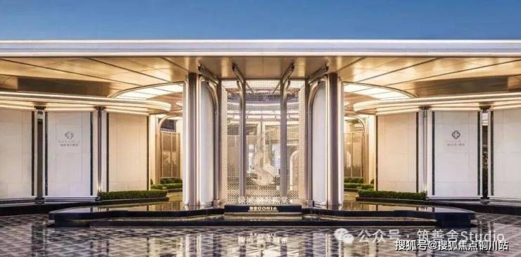 一礼「潮生望澜」,初见便显非凡气度。全长约46米的恢弘门头,凝固“钱塘潮起”的壮丽瞬间,以现代手法诠释内敛雄心。大门顶部利用大片玻璃互片来打造犹如一块巨大的水晶,贴合项目“和光粼粼”自的主题,据说是2000片波浪形水景玻璃瓦精心拼合而成。