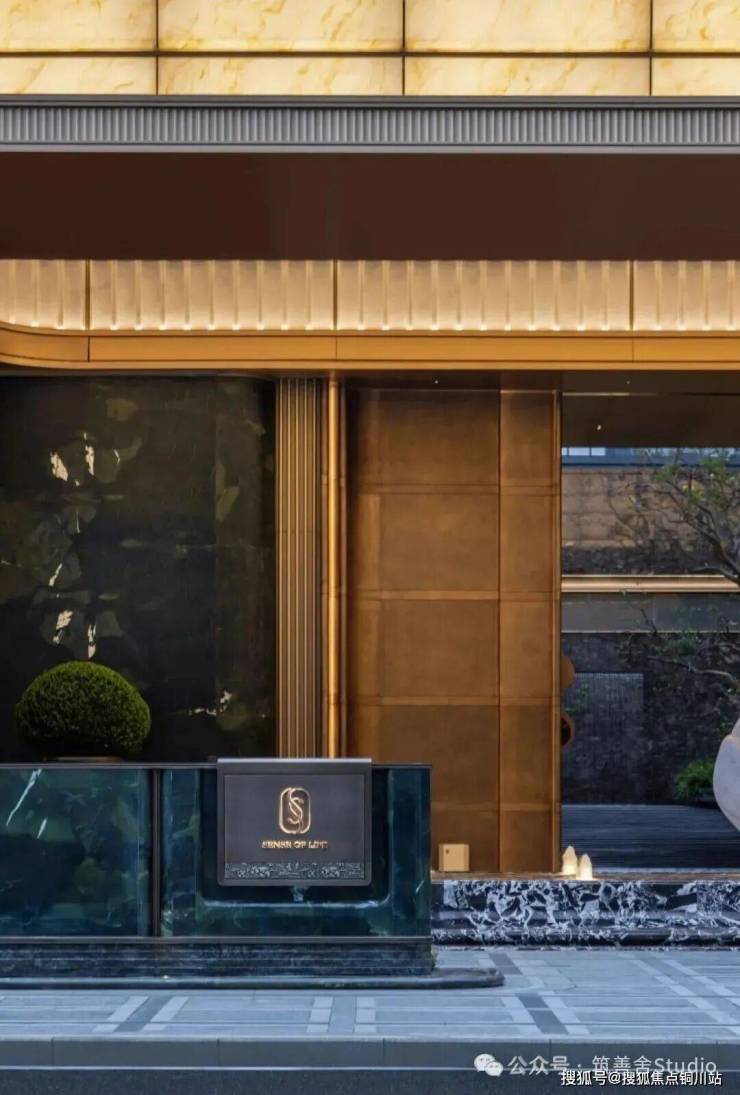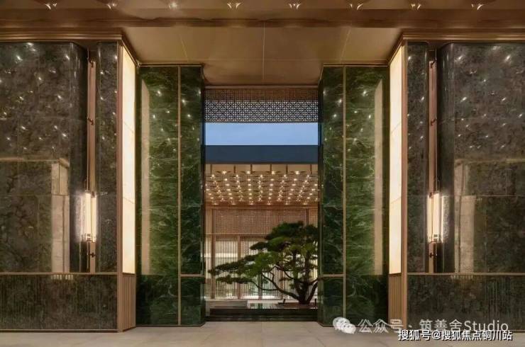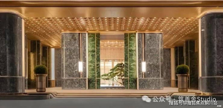 步入大门云石穹顶之下,匠心复刻古代“藻井”神韵,以522片皇家白玉精雕细琢,汇聚光华,辉映古今。华光流溢处,中心池水托举艺术雕塑,莹润皎洁,宛若稀世珍宝。立面更以铂金钻奢石铺陈,搭配墨绿荷塘月色奢石、安哥拉黑奢石花钵,以及手工锻造的巨幅铜门,于光影交错间流淌温润质感,尽显奢华风范。