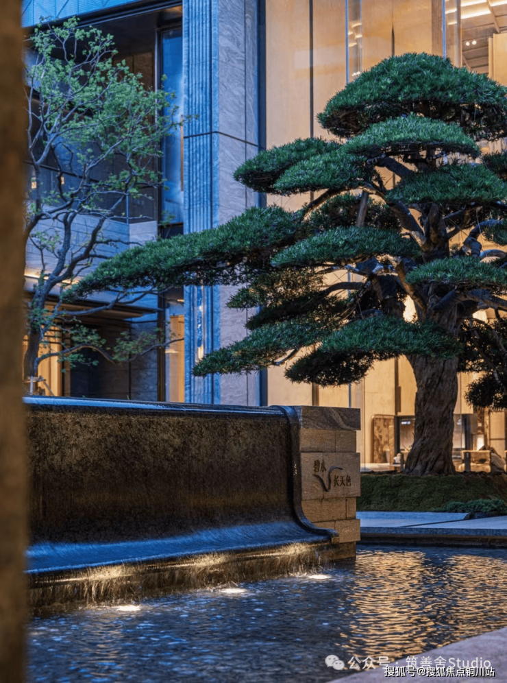 首先映入眼帘的是一座约60米长的壮观门庭,其碧波荡漾的叠水景观与挺拔的迎客松相得益彰,营造出非凡的气势与意境,彰显归家的尊贵礼仪。地面采用橄榄绿与星河灰的精致拼花设计,点缀以叠水景观,两侧迎客松更添福瑞庇佑,使得归家之路尽显非凡气韵。