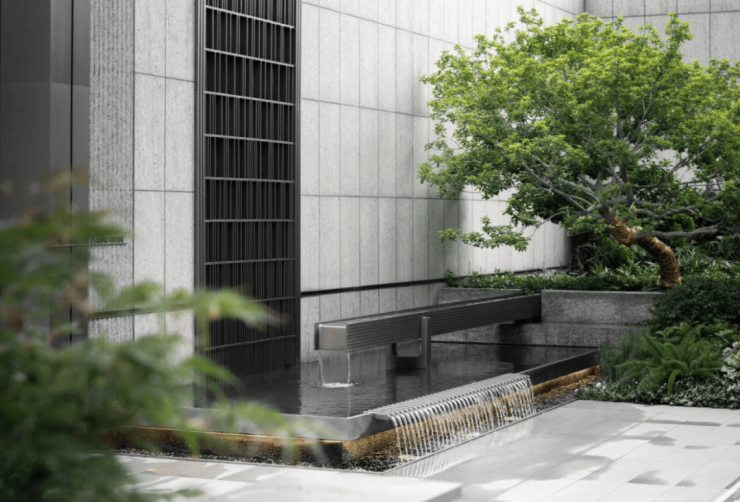 实墙与格栅的结合以虚实相生的美感,勾勒出空间的层次与韵律。斜飘的铁冬青以其自然的姿态点缀其间,枝叶舒展,为空间增添了一抹灵动与生机。底下的水流静静流淌,倒映着天光与景墙的轮廓,雕塑伫立于视野中,以优雅的姿态欢迎主人归家。