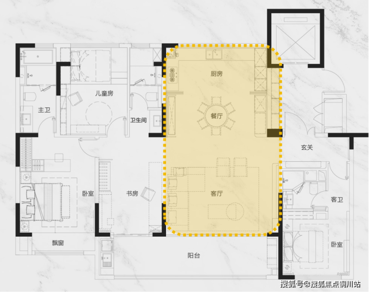 同时,由于无柱网的设计,户型中心形成了一片近60㎡的家庭互动区域,家人们能更方便的互动,营造更加紧密的家庭氛围。