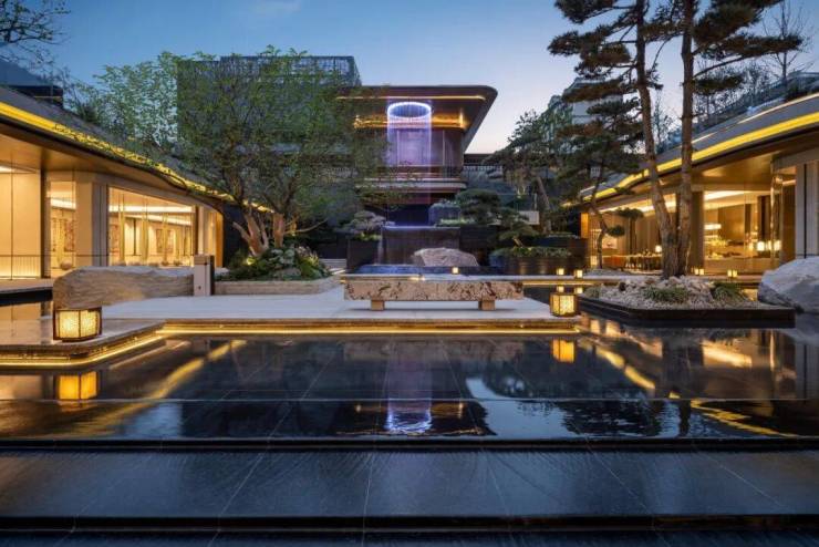 下沉水苑中,造价不菲的造型松、价值百万元的60年树龄红梅树王,相映成趣。漫步中庭水院,伯牙石与知音石错落放置,与8米高的月华飞瀑形成一方“倚石听瀑”的高山流水似的文化风景院落。