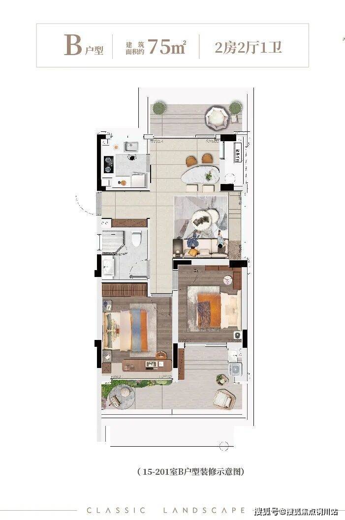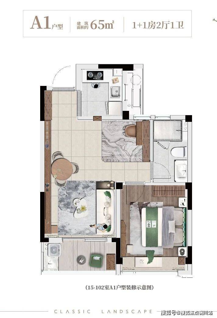 但这一次,悦山居让小宅院总价重回“六位数“。约65㎡的建筑面积,面宽却达到约6.8米,可拓展成1+1房的2厅1卫格局,连接至少27㎡的院子。