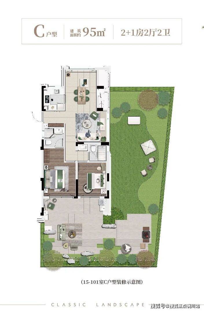 如果是边套约95㎡户型,“2+1”房2卫可做到餐客厅一体,更被L型大花园环抱,面积最大有约122㎡。
