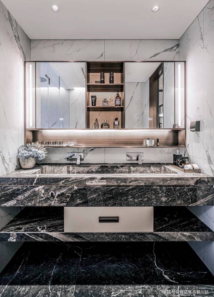 中厨定制岛台,进一步完善厨房收纳的同时更有隐藏式电磁炉等功能配置;客厅主背景墙采用超大面积“翡翠级奢石”铺贴;主卫双台盆一体化台面,由上吨重的整块石材切割成型……