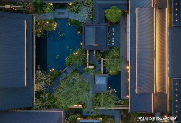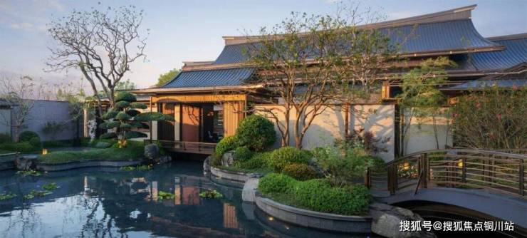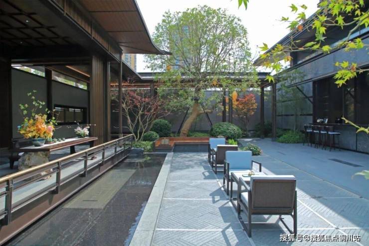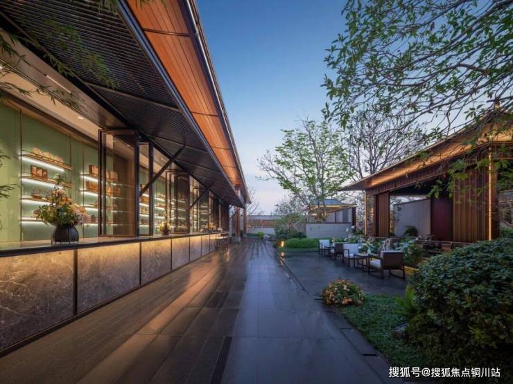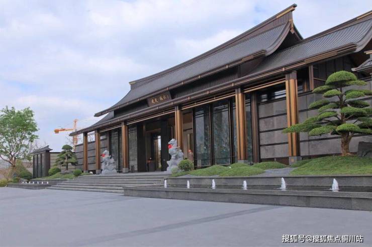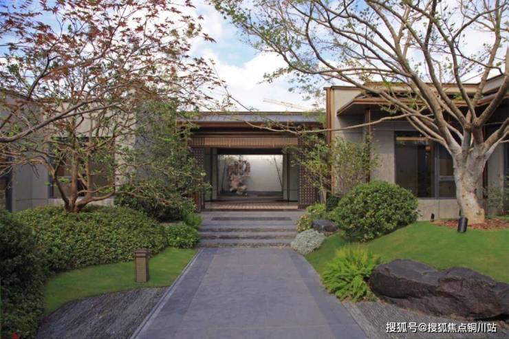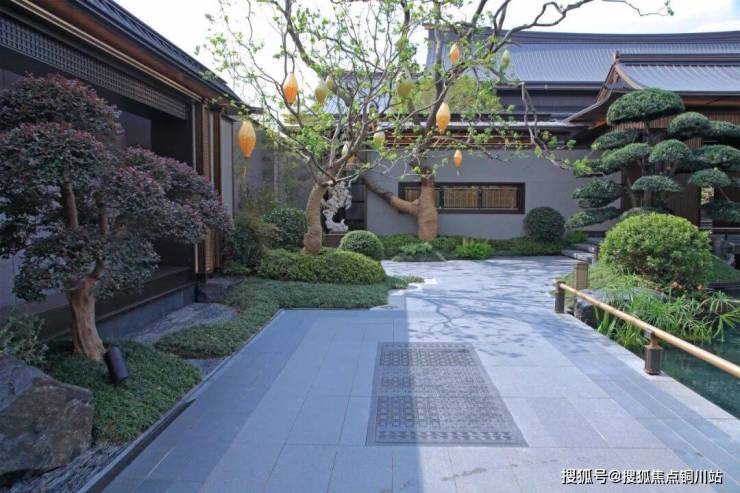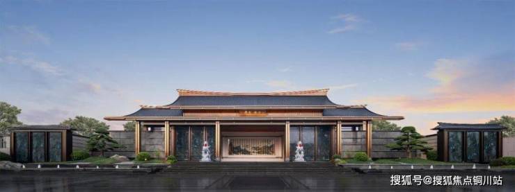 大门作为展示区的“门面”,设计灵感源自《千里江山图》的恢宏意境,宋制门堂对称格局,搭配重檐坡屋顶,两侧景墙与全冠罗汉松、石麒麟共同构成归家第一重礼序。