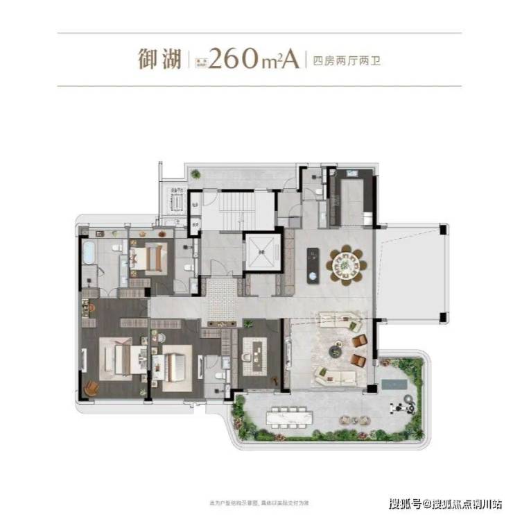 建面约260㎡观湖大宅实现一层一户、最大约23.8米南向大开间,光主卧就有4.5米,带超大空中庭院和开间超10米的LDKB,北面也有开间7.3米的大阳台。