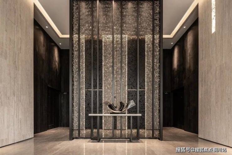 入户大堂净挑高约9.6米,刷新武汉豪宅挑高纪录。地面采用国际灰石材,迎面墙超白洞石材分布着犹如芝士切面的小洞,一灰一白,质感温润。金属壁龛错位镶嵌在迎面墙中,巴西奢石的纹理犹如宣纸泼墨的意境。