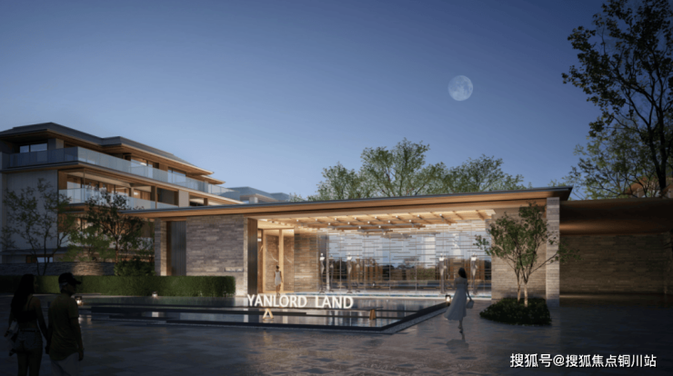 景墙两侧的叠水叮咚,恍若八音涧;形似半月的环形绿岛,犹如一扇天然的绿色屏风,还有各类灯光配置。一个入口设计,细致到不可思议。