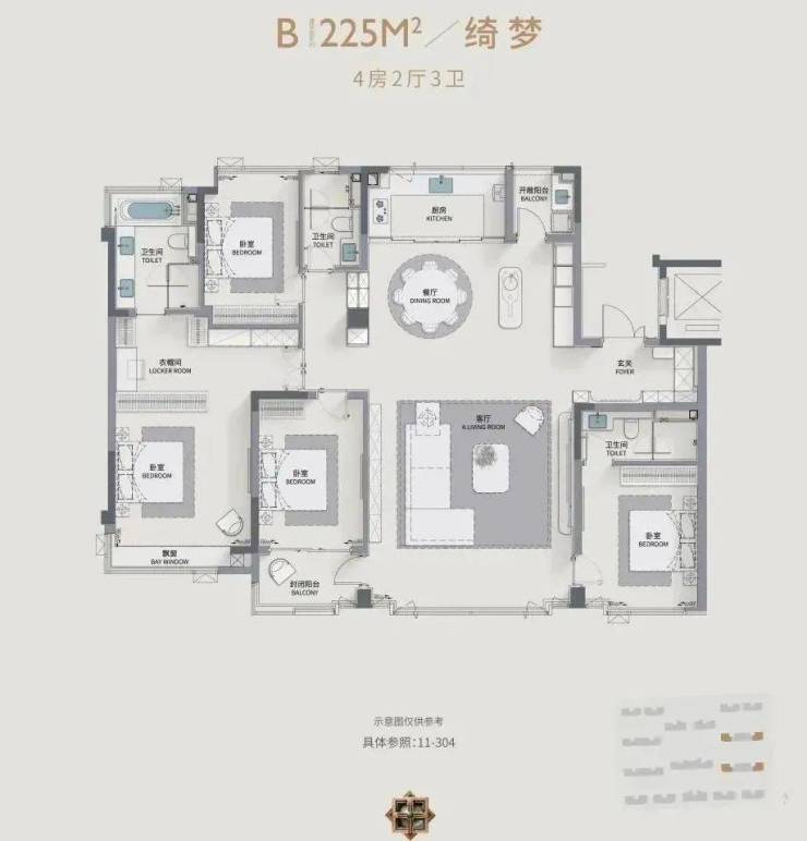 建筑面积约225平 4房3卫