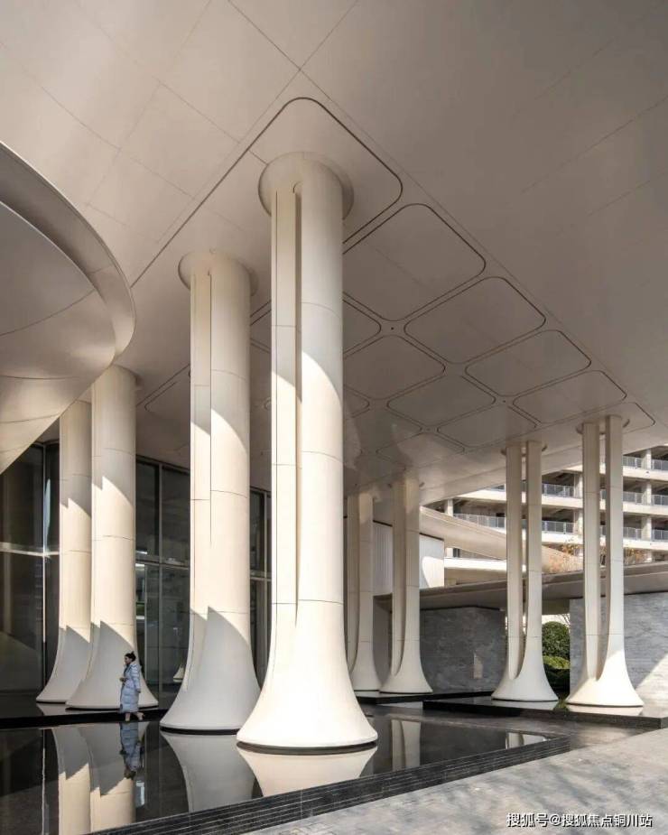 踏入长江天际的大门,映入眼帘的是8根跨度非常大的树形空间立柱,它们雄伟地屹立在门庭之中,这些柱子是由江苏惠全UHPC超高性能混凝土板材精心打造而成,如同向上生长的巨树,营造出雨林系生机勃勃的感觉,充满生命力。