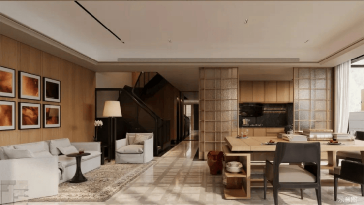 一楼LDKG一体化设计,不仅让空间更加完整,还增强了家庭成员间的互动。南向客厅+餐厅的一个巨大开间,搭配大面的落地窗。