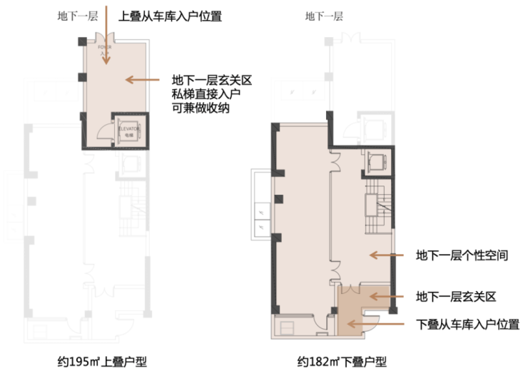 每套叠墅均有地库直接归家动线。无论是上叠还是下叠,都在地下一层有独立专属门厅,且面积不小。